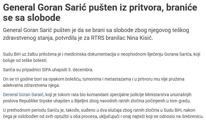 Inače, Apelaciono vijeće Suda BiH pravosnažno je oslobodilo nekadašnjeg komandanta Specijalne brigade policije MUP-a Republike Srpske Gorana Sarića krivice za zločine u Srebrenici u julu 1995. godine.